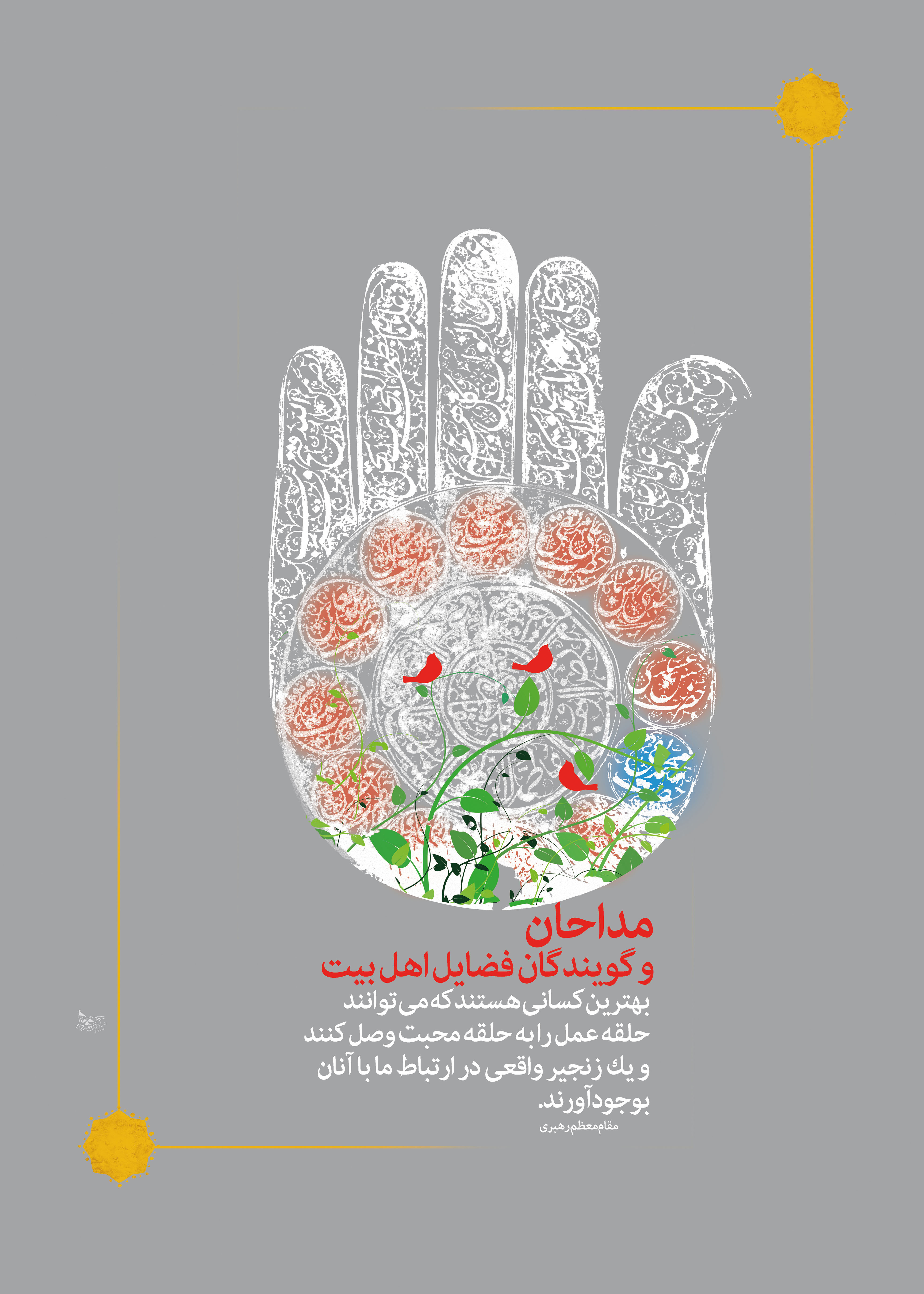 در روز پنجم فروردین امسال مصادف با روز شهادت حضرت صدیقه ی طاهره سلام الله علیها سعادتی برای این حقیر به وقوع پیوست که حتی در تصورم نمی گنجید، توفیقی رفیق شد تا به زیارت مقتدا و مرادمحضرت امام خامنه ای حفظه الله نایل شوم و در پس از اقتدا به ایشان در نماز مغرب و عشاء به تماشای خورشید وجودشان بنشینم و سیمای نورانی شان را زیارت کنم. پس از اقامه ی نماز و دیدار چهره به چهره ی ایشان با تعداد معدودی نمازگزار، توفیقی شد که امتیاز چهل پوستر سبک زندگی به همراه یک آلبوم از آن را به رهبر بزرگوارم هدیه نمایم و لحظه ای هم که شده موجب انبساط خاطر امام و مولایم را فراهم آورم. ایشان پس از احوال پرسی با رویی گشاده پس از تورق چند برگی از آلبوم، از چگونگی طراحی ها پرسیدند که به اختصار توضیحی کوتاه خدمتشان عرضه داشتم که پس از فرمایش حضرتتان در خراسان شمالی و بحث سبک زندگی عزمم را جزم کردم که از ناحیه ی خودم حرف شما بر زمین نماند و خدمتی کوچک کرده باشم. به پیوست آلبوم، نامه ای نیز به ایشان دادم که توضیحی از کار و نشان ارادتی محضر حضرتشان بود که در زیر می آید.